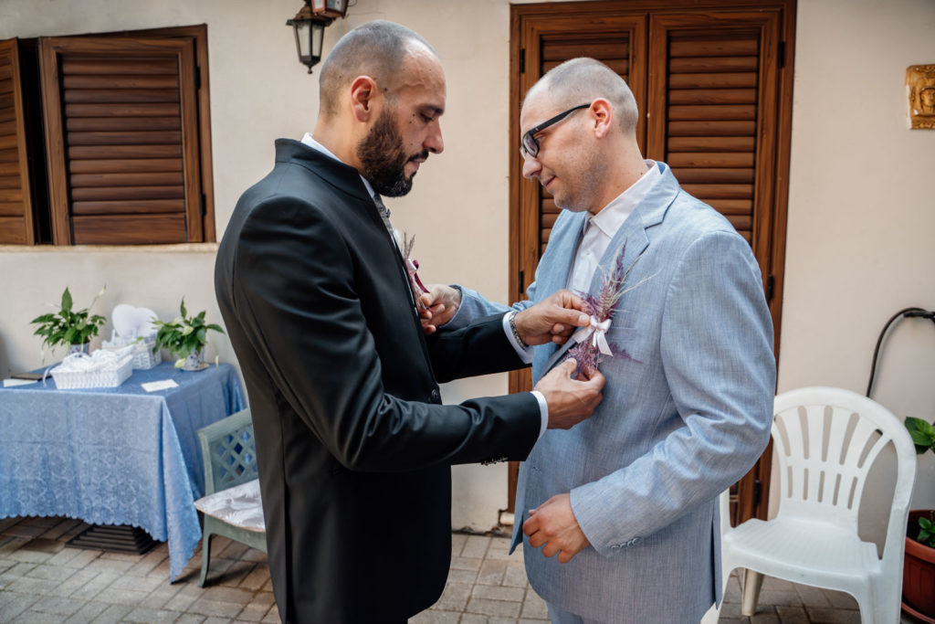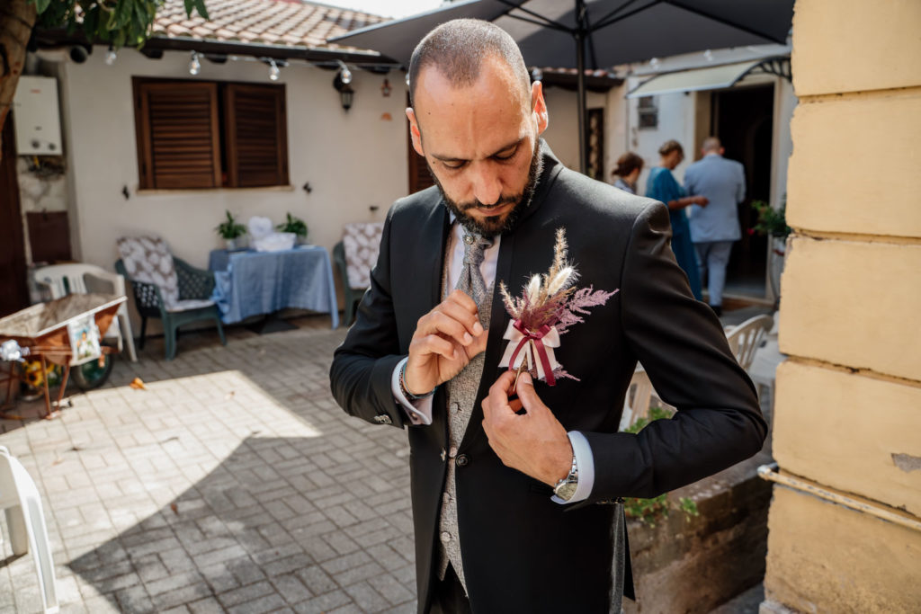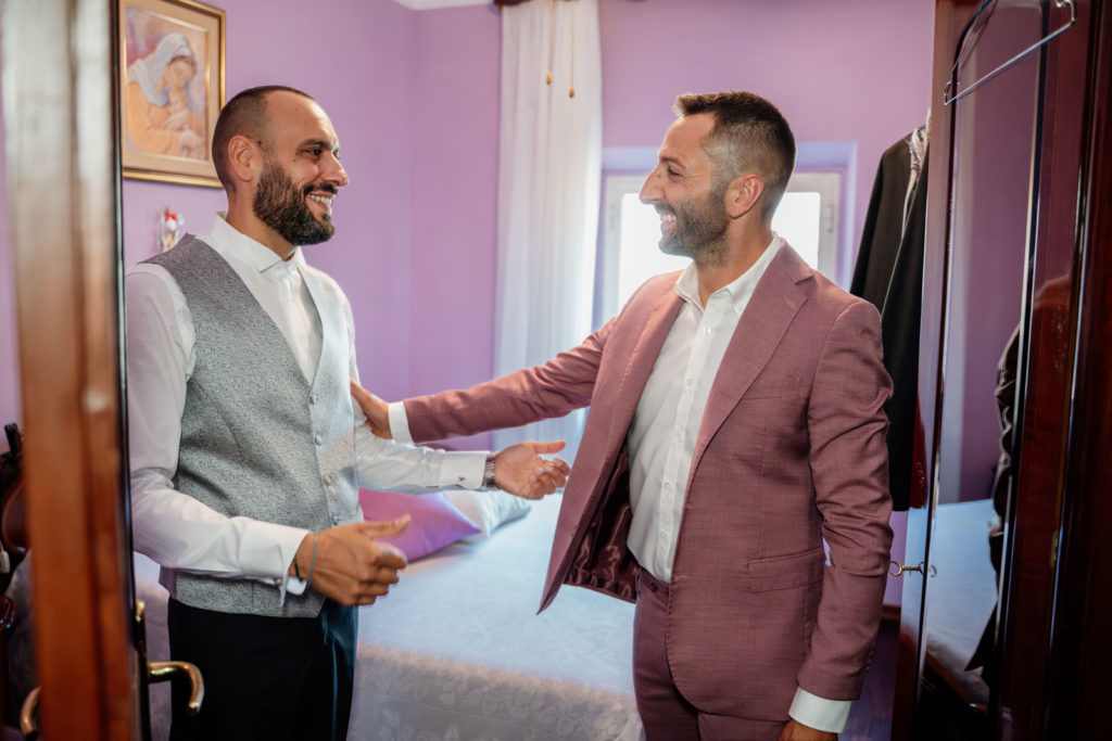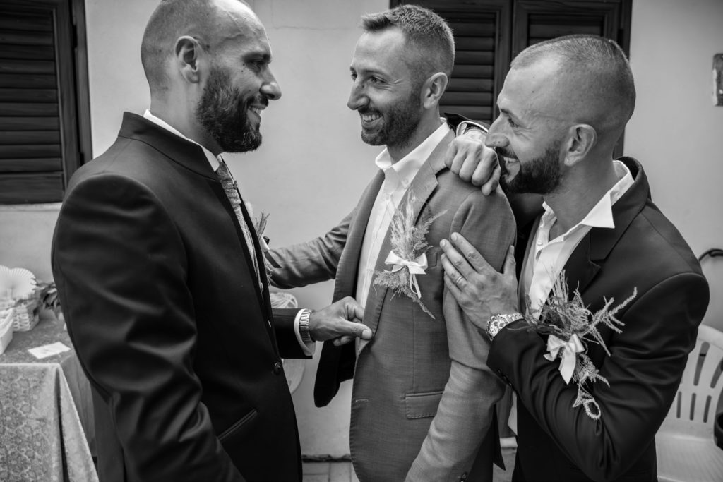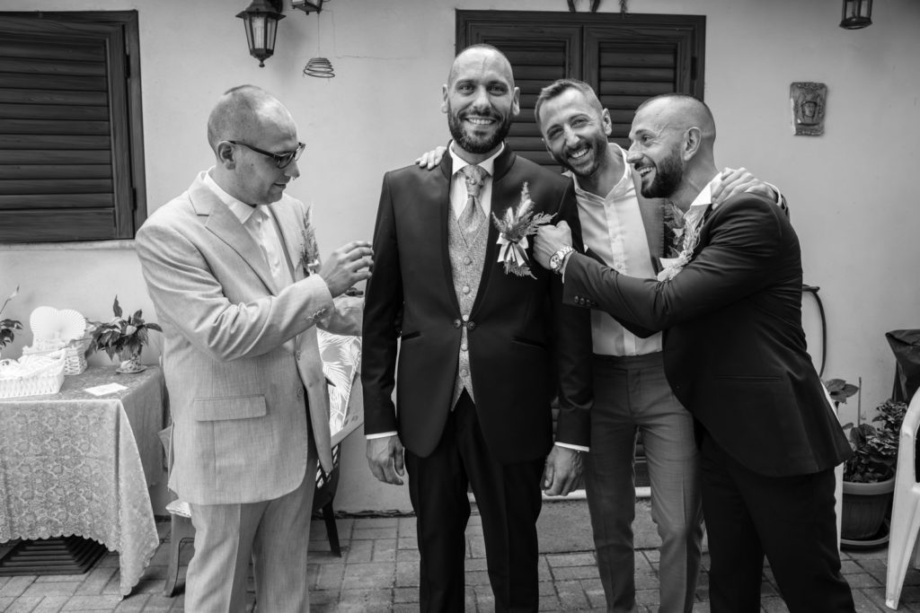 I preparativi di Francesco, lo sposo, sono stati intensi e soprattutto pieni di emozione; insieme alla sua famiglia, a suo fratello e ai suoi amici, la sua preparazione è stata come fare un salto nel suo passato, rivivendo i legami, gli istanti e soprattutto le emozioni che hanno sempre contraddistinto la sua anima; perché divertirsi è anche emozionarsi e, con essi, emozionare chi ti sta vicino da sempre ed è proprio questa la magia di quel preciso momento, assaporare ciò che è stato, con la consapevolezza di vivere la bellezza del momento, la bellezza di un legame, la bellezza del proprio essere.