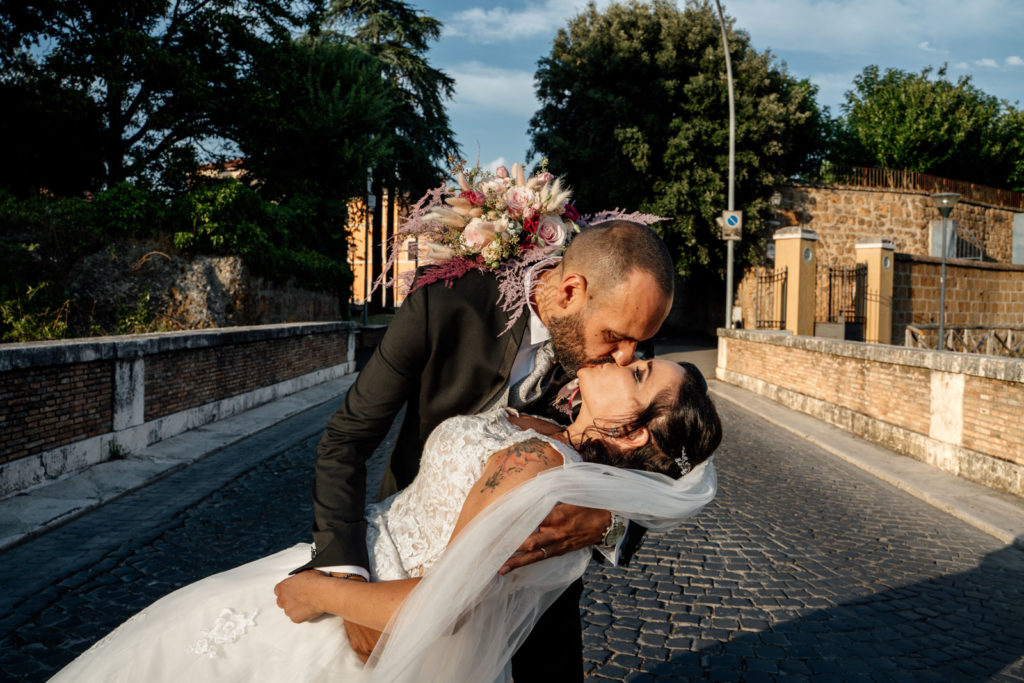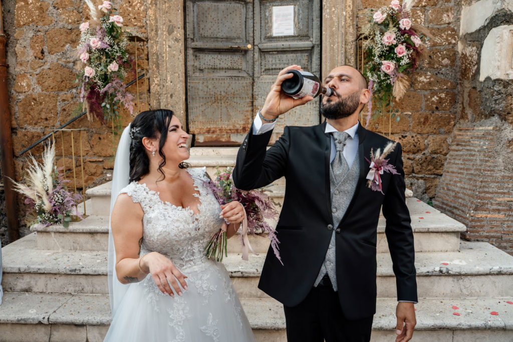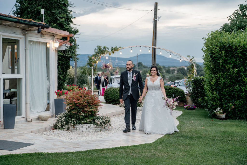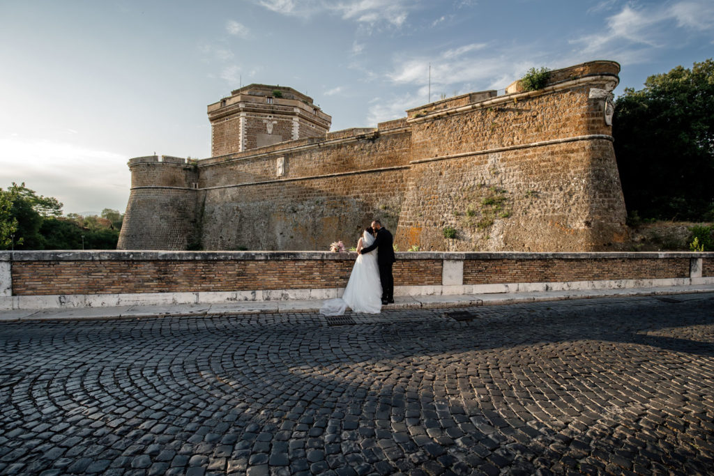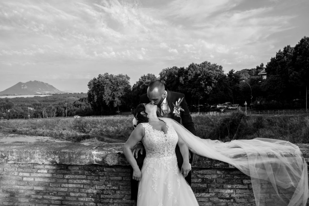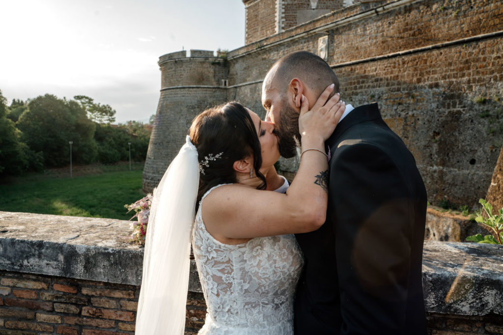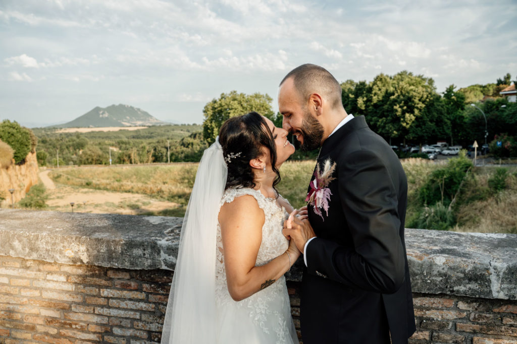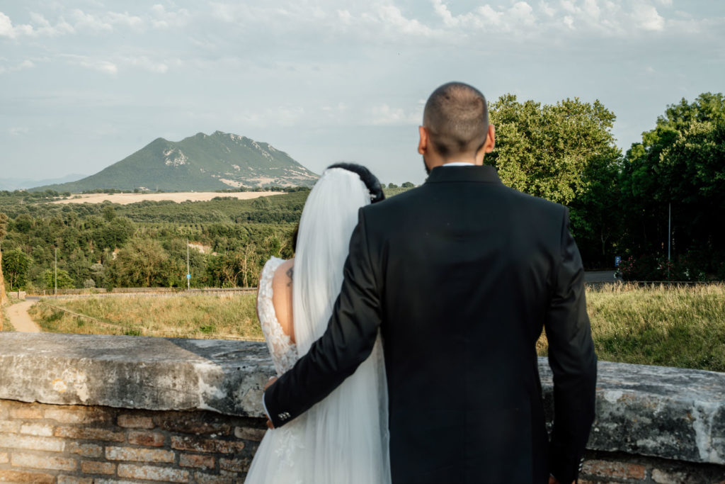 Con un sole estivo che giungeva al tramonto, il Monte Soratte sullo sfondo, le fotografie realizzate in esterna a Civita Castellana, con sfondo uno dei simboli di Civita Castellana, il Forte San Gallo (Museo dell’Agro Falisco), sono state per gli sposi un vero momento di totale intimità da passare completamente in solitaria, prima di raggiungere e continuare a celebrare la loro festa a Colle Salomonio.