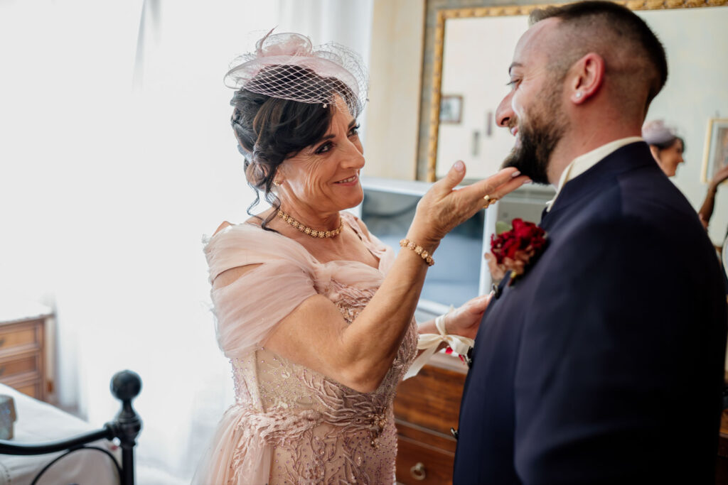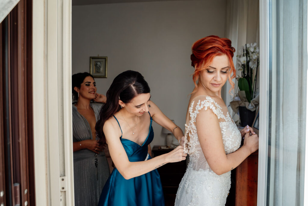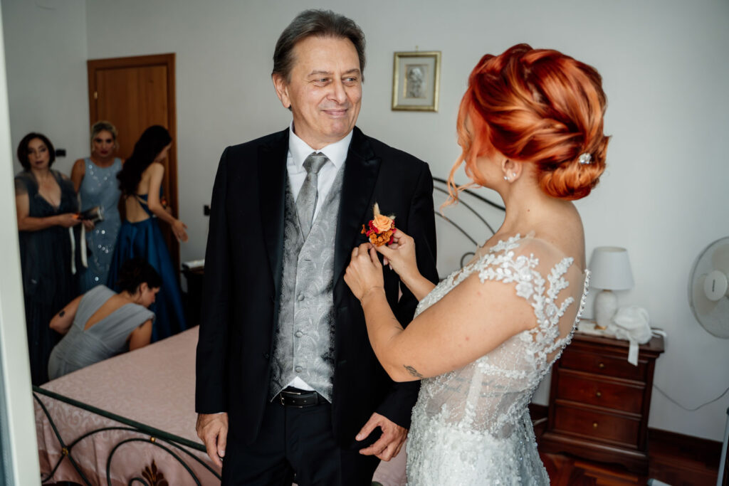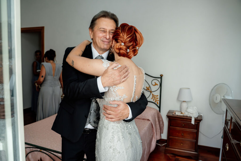 E i preparativi di Stefania, la sposa, sono stati davvero molto intimi, delicati, vividi e la presenza delle sue sorelle, nonché damigelle, ha profondamente contribuito a generare delle forti emozioni. Perché vivere quei momenti con le persone a te più care non solo donerà dei ricordi ancora più forti al tuo matrimonio, ma genererà dei ricordi così vivi, così unici e autentici, che non solo ti faranno emozionare, ridere e soprattutto divertire ogni volta che rivedrai quelle fotografie, ma ti trascineranno ogni volta in quel tempo come se fosse sempre sospeso tra una realtà e l’altra. E, con l’arrivo dei suoi genitori, le emozioni non si trattengono più ed esplodono come è giusto che sia.