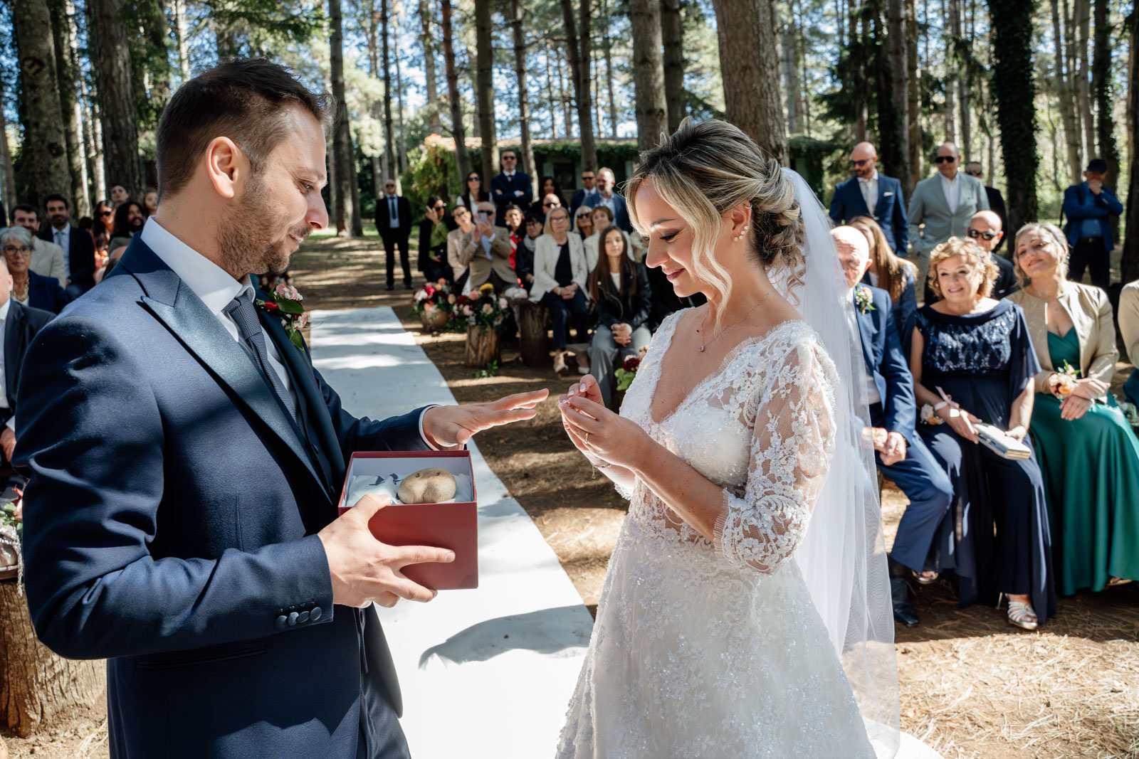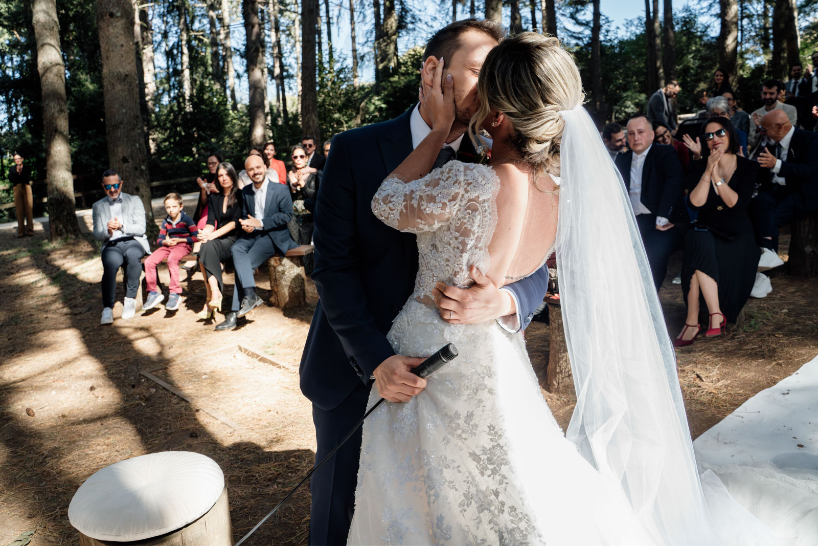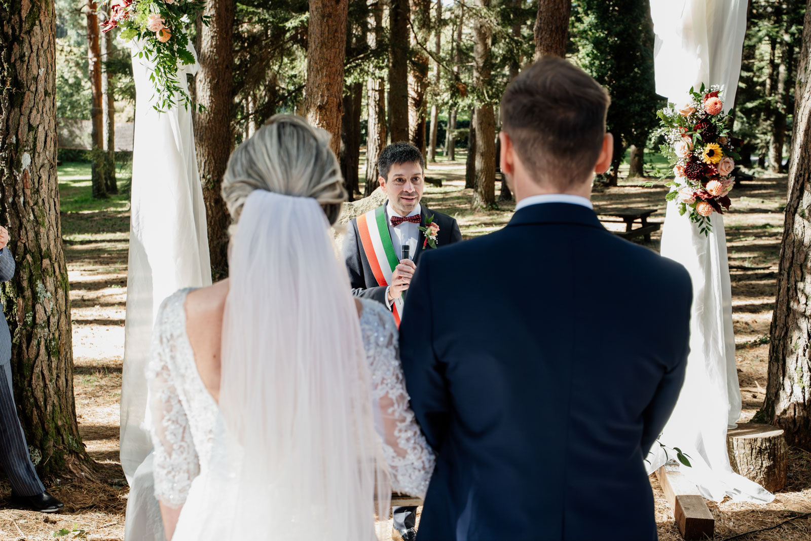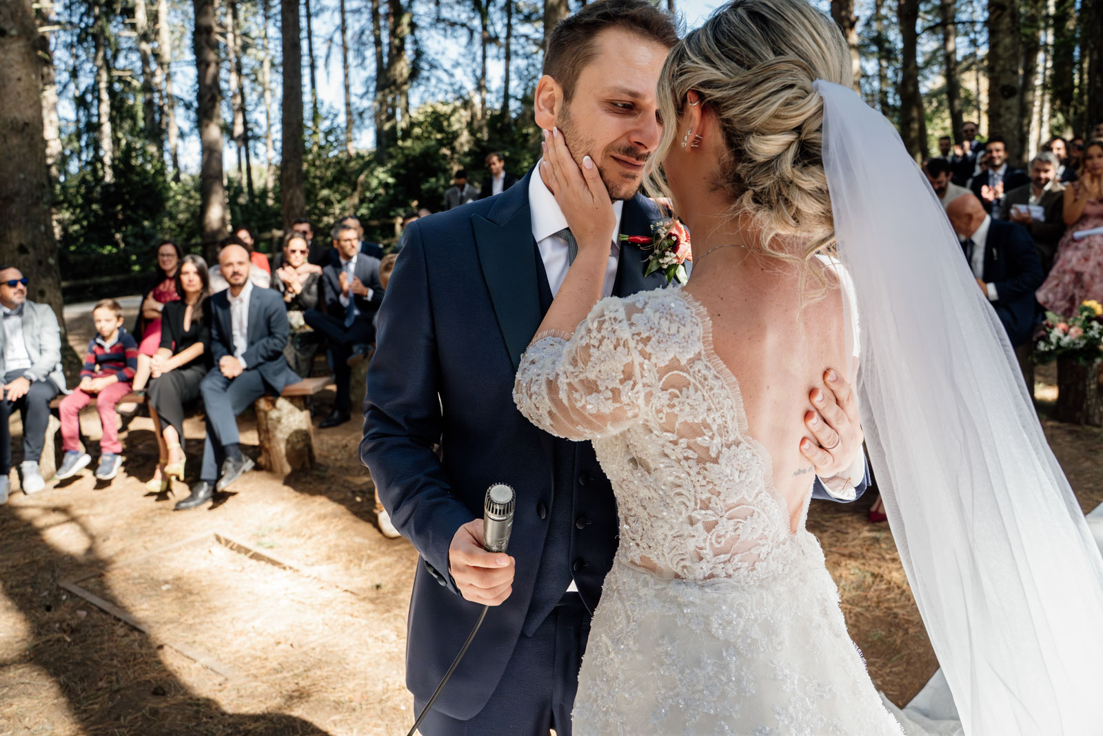 E il loro rito civile è stato meraviglioso! Osservare, durante il loro matrimonio al Parco dei Cimini, le emozioni degli sposi all’entrata e durante tutta la cerimonia (la cerimonia si è svolta all’interno di un fantastico bosco, a stretto contatto con la natura), come vedere quelle di tutti gli invitati e delle loro famiglie, è stato come assistere ad una vera opera d’arte emozionale; perché vivere in questo modo il matrimonio è come vivere in prima persona la storia d’amore di chi fotografi.